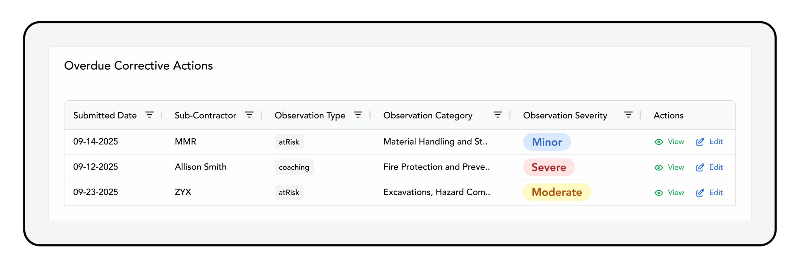 Track open corrective actions by site, severity, or owner with just a few clicks. When you can easily identify overdue items, you can hold crews accountable and reduce delays.